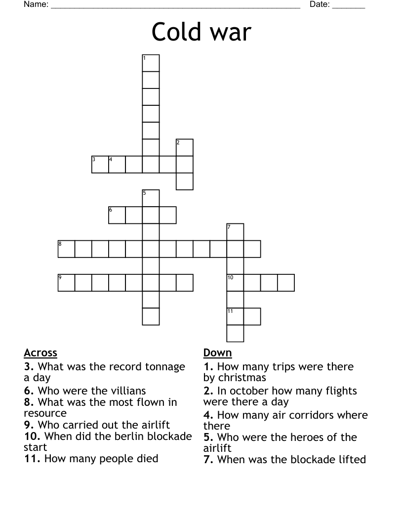 Struggle for power that took place between the united states and the soviet union after ww2. Web the crossword solver found 30 answers to cold war, 3 letters crossword clue. Web crossword with 10 clues. Customize with your own questions, images, and more.