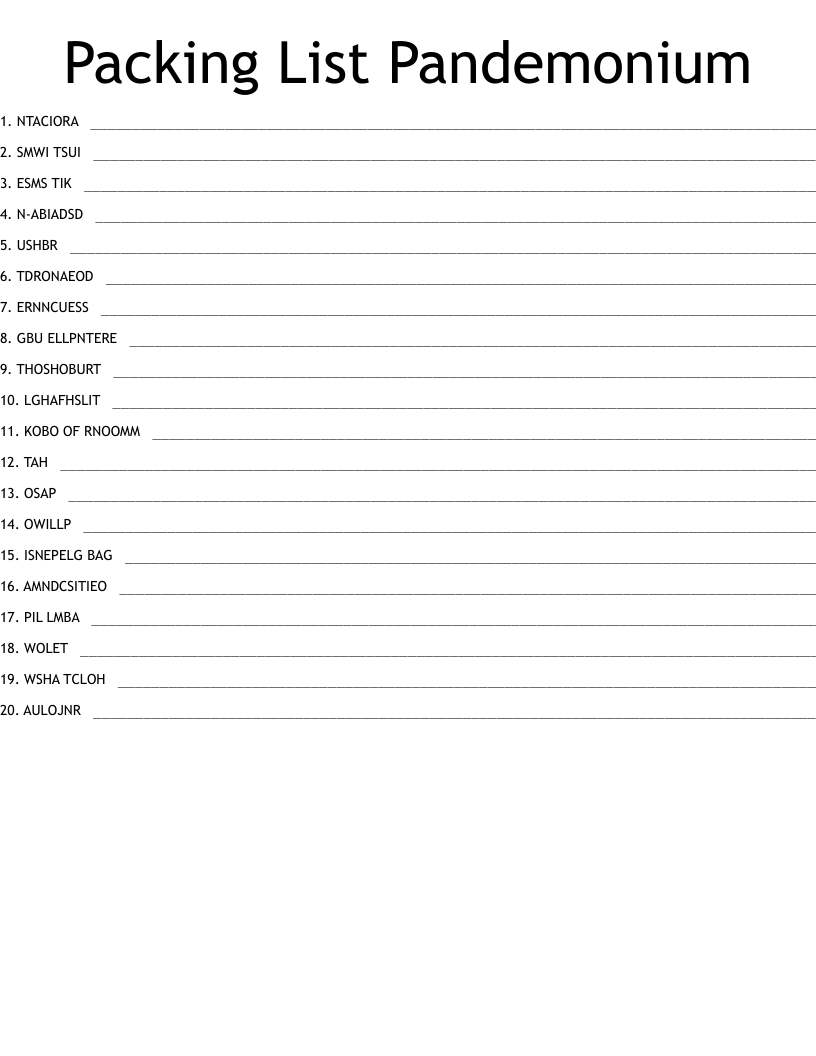 Packing List Pandemonium Word Scramble WordMint