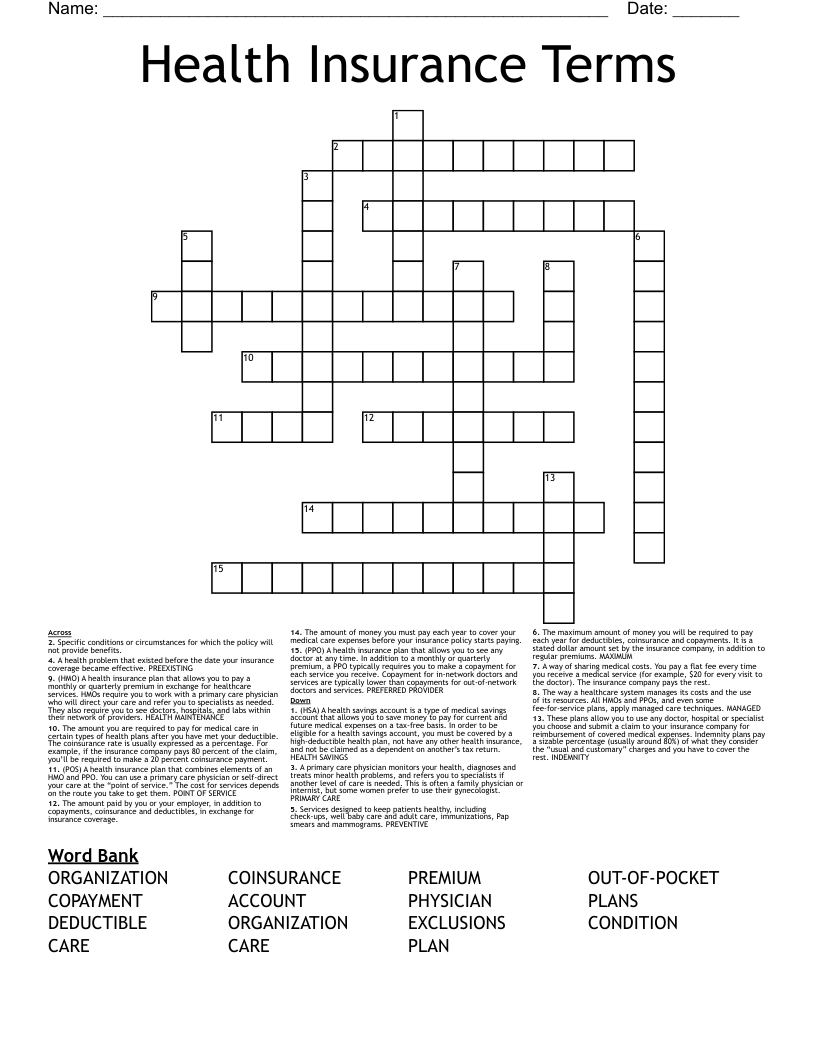 Health Insurance Crossword Puzzle WordMint
