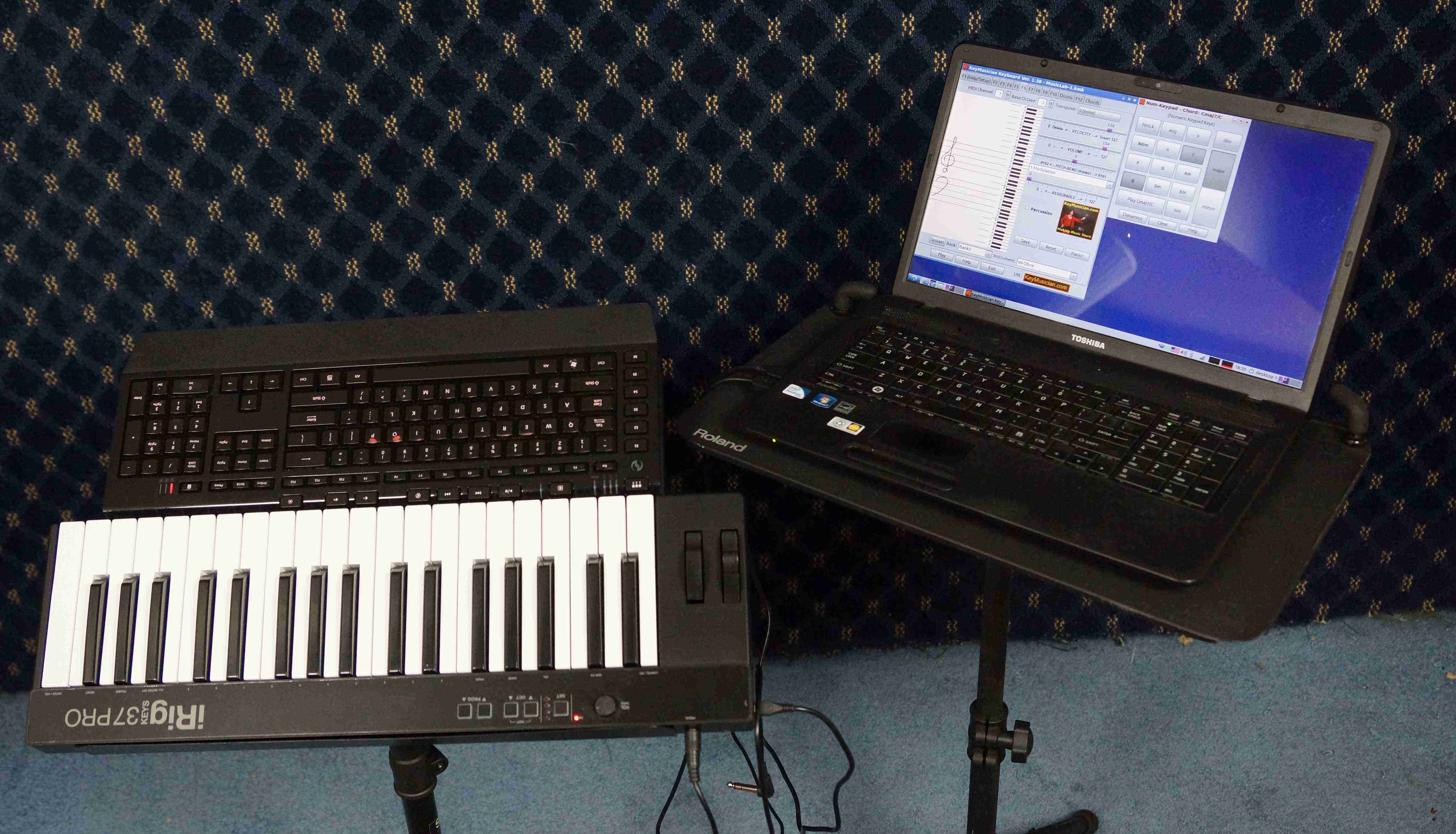Thehybrid instrument, here using an iRig37, along with a gamerskeyboard, on a music stand, with