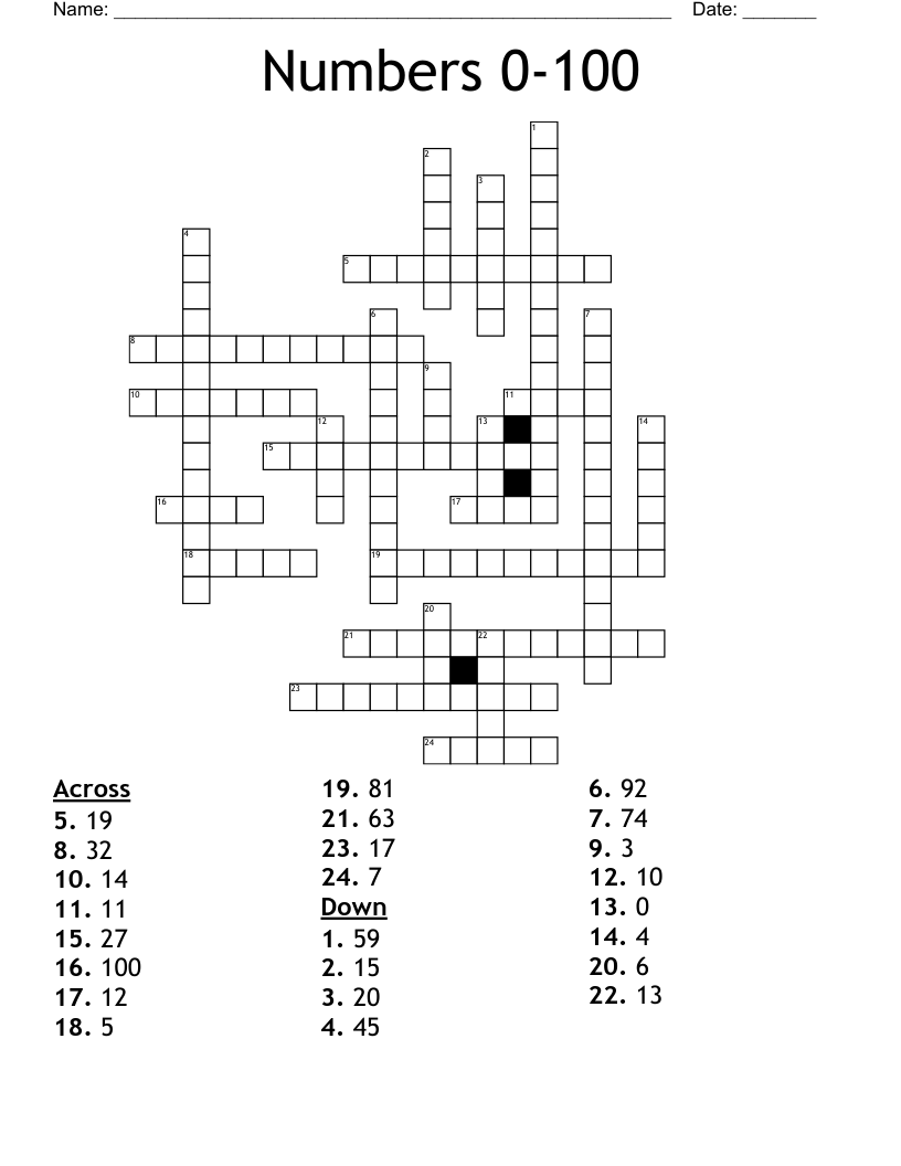 Numbers in English 0 100 Crossword material de la siguiente asignatura English / Inglés