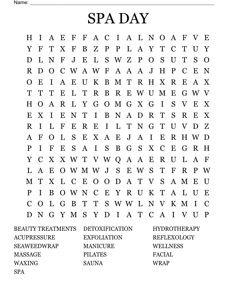 Spas & Beauty Services Crosswords, Word Searches, Bingo Cards WordMint